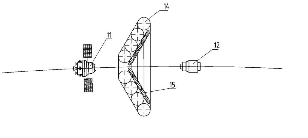 Для захоплення і подальшого усунення з орбіти некооперованих фрагментів космічного сміття запропоновано аеродинамічний пристрій, що формується зовнішнім шаром тороїдальних оболонок, які утворюють конічну поверхню, та внутрішнім шаром, який за рахунок примусового наддуву або вспінювання аерогелю фіксує фрагмент космічного сміття до сходу його з орбіти (рис. 1 – 3).